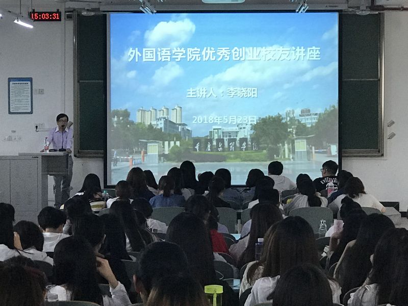 5月23日,我院英语专业2002级校友、重庆高标国际贸易有限公司、重庆商洛贸易有限公司(中美合资)总经理李晓阳先生应邀在知行楼B602作了题为“少数人的路,是多数人的梦想”的讲座。我院学工办主任、团总支书记张铁红、2016级辅导员李桂芳老师以及全体2016级学生共计200余人聆听了讲座。