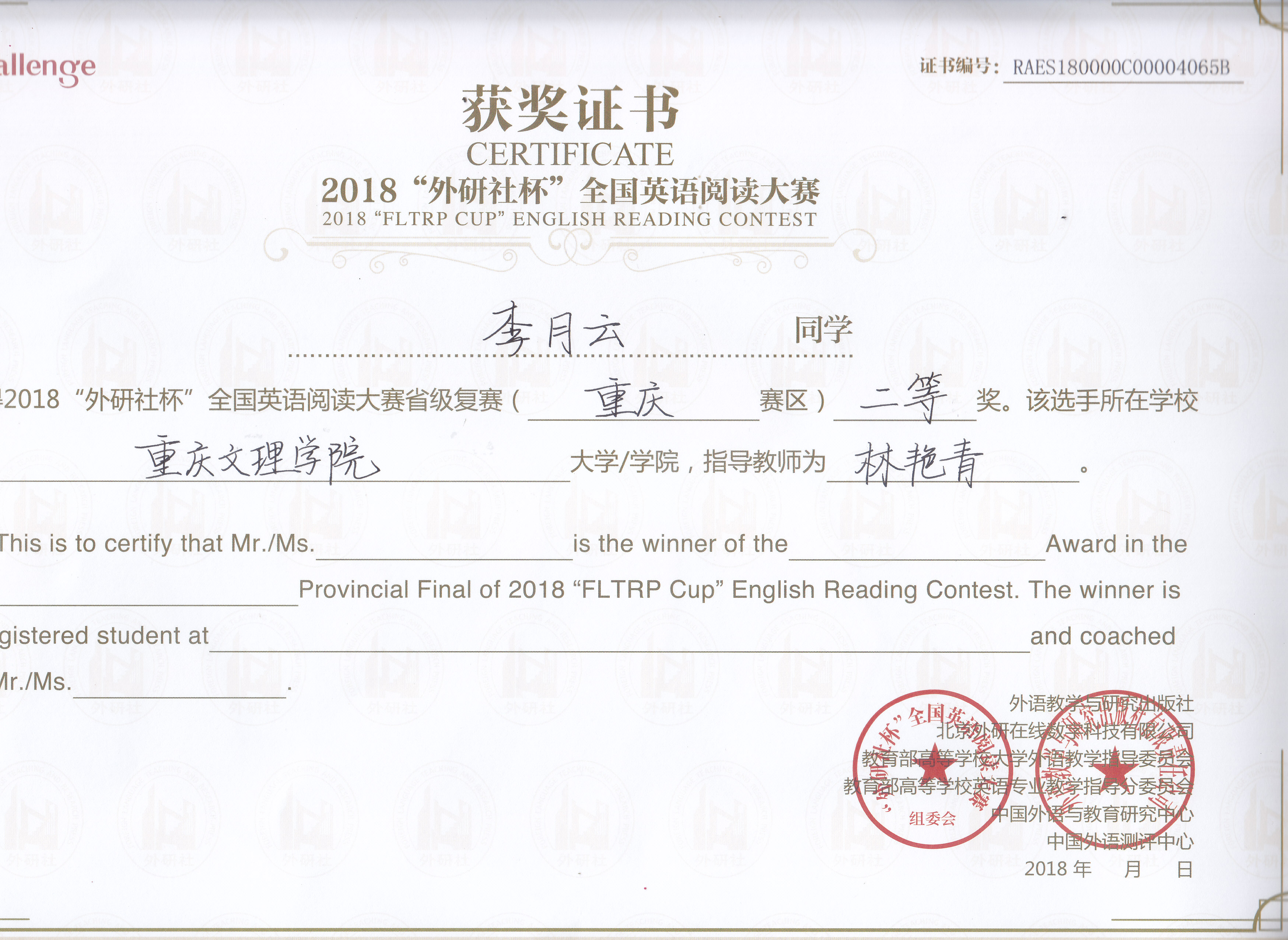 我校选派了六名选手参赛。经过层层角逐,由林艳青老师指导,来自betway西汉姆联的李月云同学荣获英语阅读比赛的二等奖,来自教育学院的罗雨妃同学荣获英语阅读比赛的三等奖。由张鹏老师指导,来自betway西汉姆联的谭周男同学和教育学院的肖粤同学荣获本次写作大赛的三等奖。由曾薇老师指导,来自betway西汉姆联的李林炜同学和材料与化工学院的白亚楠同学分获演讲比赛英语专业本科组和大学英语本科组的三等奖。
