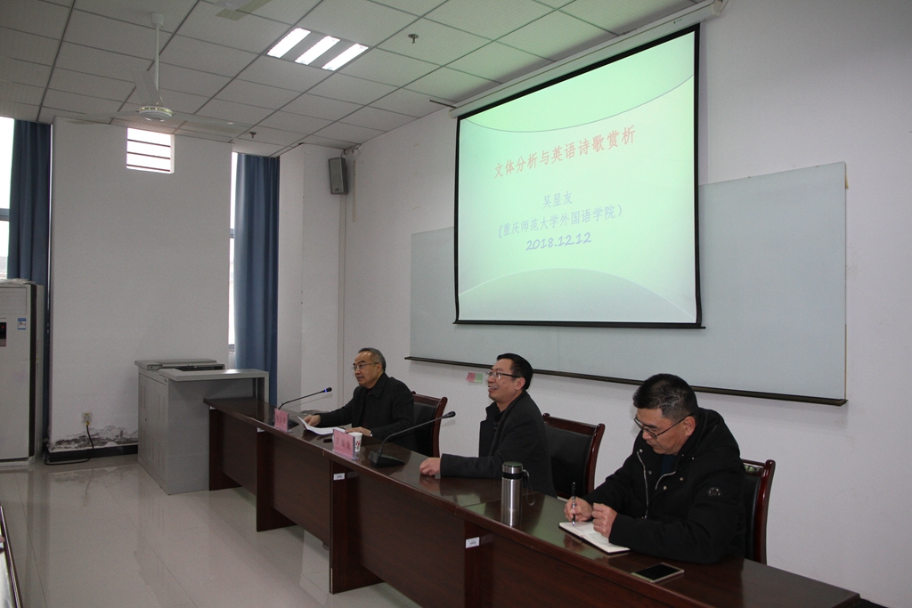 12月12日,应我院邀请,重庆师范大学betway西汉姆联院长吴显友教授在格术楼A701为我院部分师生作了题为《文体分析与英语诗歌赏析》的讲座。讲座由我院院长刘安洪教授主持。
