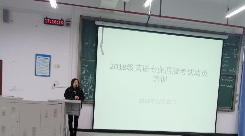 12月25日下午,我院在知行楼B601举行了2018级英语专业四级考试动员培训,培训由我院副院长刘俊玲主持,2018级全体学生参加了培训。