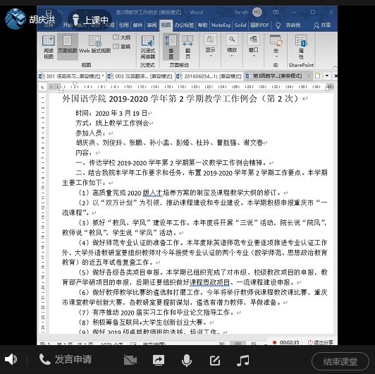 3月19日,我院召开了2019-2020学年第二学期教学工作例会视频会。我院副院长胡庆洪、刘俊玲、教学办主任张鹏、教研室主任孙小孟、彭娅、曹胜强、杜玲及教学秘书谢文春参加会议。会议由刘俊玲主持。