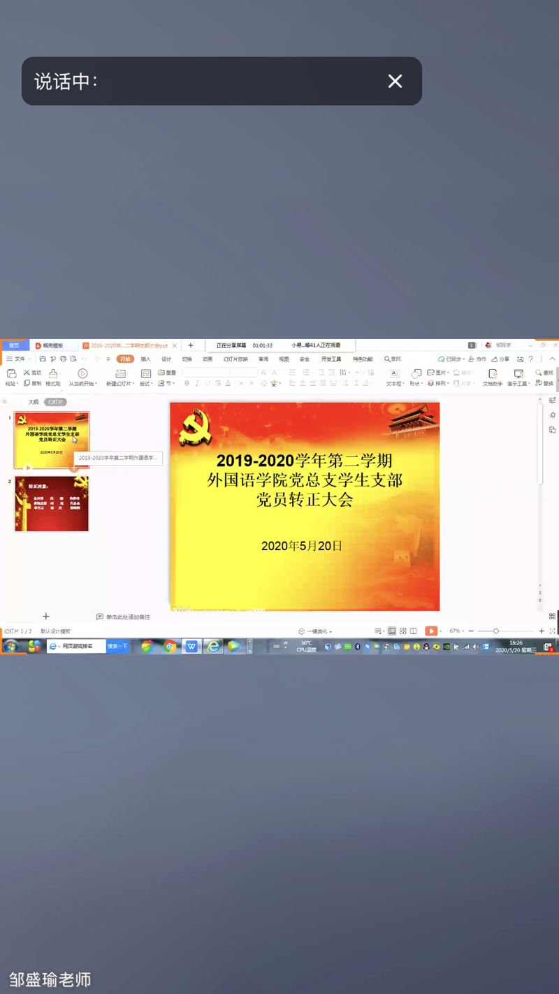 5月20日下午,我院通过QQ网络组织了党员转正大会,支部全体党员、入党介绍人、部分积极分子参加了会议,会议由学生支部书记邹盛瑜老师主持。