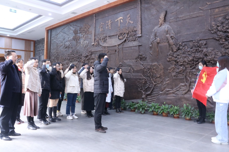 最后,在支部书记邹盛瑜老师的领誓下,支部全体党员在喻茂坚纪念馆大型展厅,面向党旗庄严宣誓。接着,党总支书记杜勇为本年度新发展的学生党员发放入了党通知书和党徽。