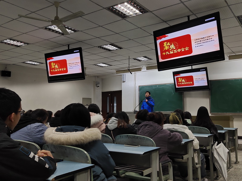 宣讲活动主要从党的十九届五中全会审议通过的《中共中央关于制定国民经济和社会发展第十四个五年规划和二〇三五年远景目标的建议》着手,对党的十九届四中全会以来的工作、全面建成小康社会的决定性成就、2035年基本实现社会主义现代化远景目标、“十四五”期间的经济社会发展主要目标和工作要求做了全面宣讲,同学们认真听讲、纷纷表示,将把自己的个人目标融入国家经济社会发展大局,刻苦学习,奋发有为,为实现中华民族伟大复兴的中国梦而不懈努力。