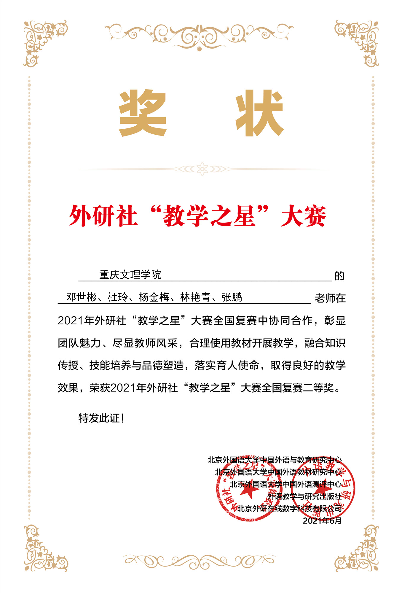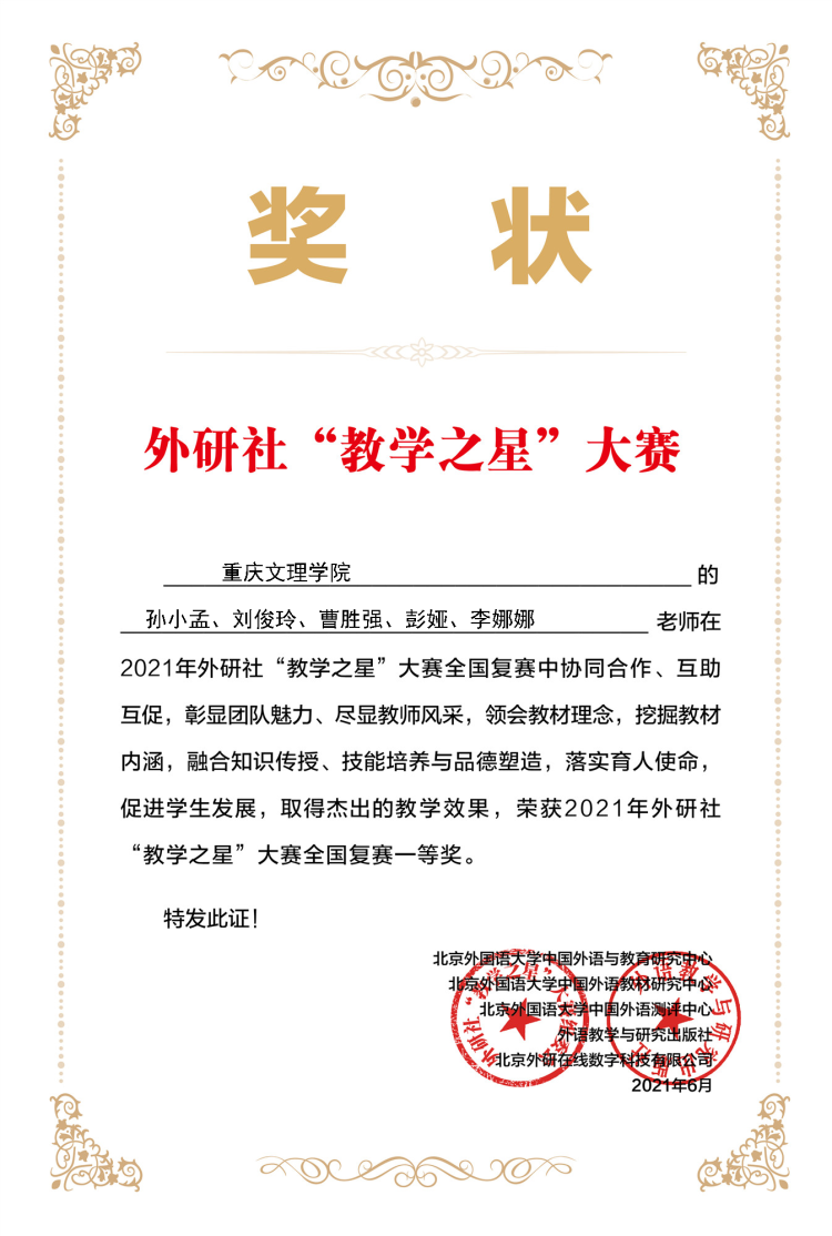 近年来,我院全面贯彻全国教育大会和新时代全国高等学校本科教育工作会议精神,认真落实《教育部关于一流本科课程建设的实施意见》,积极响应学校一流课程建设的要求,打造金课,推动教学范式改革,取得了阶段性的成果,目前已获得重庆市本科高校一流外语在线课程建设与应用重点项目立项。本次大赛教师获奖是学院推进课程教学改革、培养优秀教学团队的成功体现,对深入实施新文科建设将起到较大的推动作用和指导意义。
