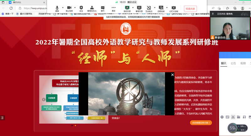 系列研修班由“以研促教”、“以赛促教”、“以云促教”三大板块构成,旨在为外语教师提供共建、共享、共发展的平台。通过高瞻远瞩的专家指引,特色多样的同行展示,丰富深入的研修内容,启发和激励高校外语教师成为“经师”与“人师”的统一者,成为精于传道授业解惑的“大先生”,做学生为学、为事、为人的示范,真正承担起为中华民族伟大复兴培育时代新人的重任,不负时代和人民赋予的光荣使命。此次集体线上研修,主要围绕教学发展系列讲座《跨文化交际课堂思政教学案例分析》进行回看学习,并展开研讨。通过观摩学习课程思政教学案例,教师们加深了对课程思政理念内涵的理解,针对课程思政教学怎么实施、研究怎么开展有了更清晰的认识。