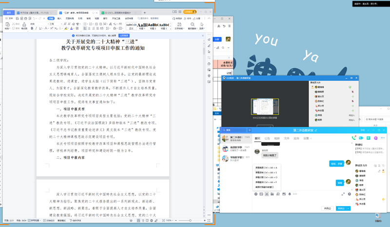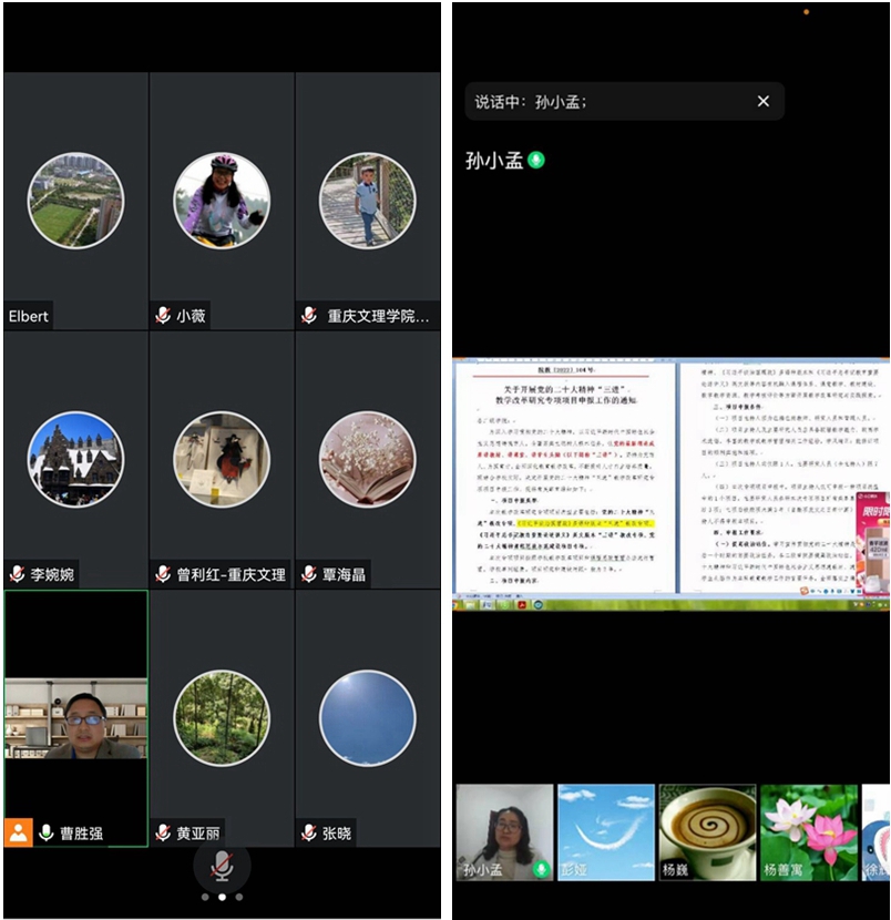 下午2:30,各教研室主任通过QQ群通话召开了视频会议。本次教研活动主要围绕以下四点展开:一是学校第八届教师“说课程·教改课”暨教学创新比赛的方案学习与动员;二是党的二十大精神“三进”教学改革研究专项项目的申报,以及外语“三进”工作的学习研讨;三是英语师范专业认证的准备情况说明;四是期末命题相关工作的商讨和说明。