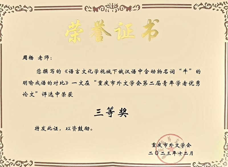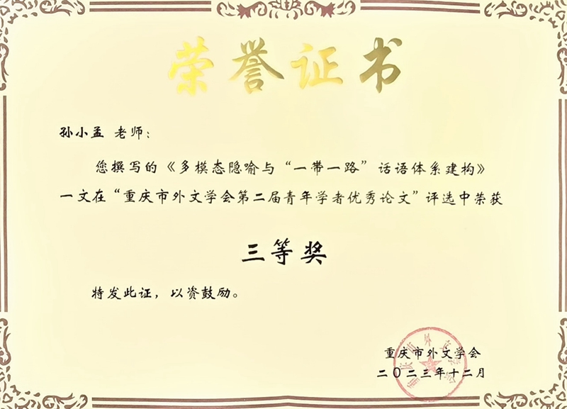 闭幕式上,主持人四川外国语大学赵永峰教授宣读了“重庆市外文学会第二届青年学者优秀论文”评选结果。我院孙小孟老师撰写的《多模态隐喻与“一带一路”话语体系建构》、周杨老师撰写的《语言文化学视域下俄汉语中含动物名词“牛”的明喻成语的对比》两篇论文喜获三等奖。