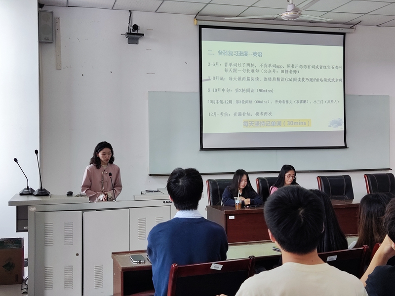 会上,2024届考研学生代表刘爱玲、谭轲月、胡旋等结合自身经验,就考研院校报考、专业选择、复习规划等方面做了耐心细致地讲解,对学习心态调整、备考习惯和方案给出了确切可行的建议,为我院准备考研的学生提供了满满“干货”。随后,他们还就专业课、公共课复习等问题交流了经验,进行了答疑解惑。他们鼓励大家调整心态,坚定目标,坚持不懈。本次专题分享会既为计划考研的学生提供了经验,也为复习备考等具体问题给予了指导。