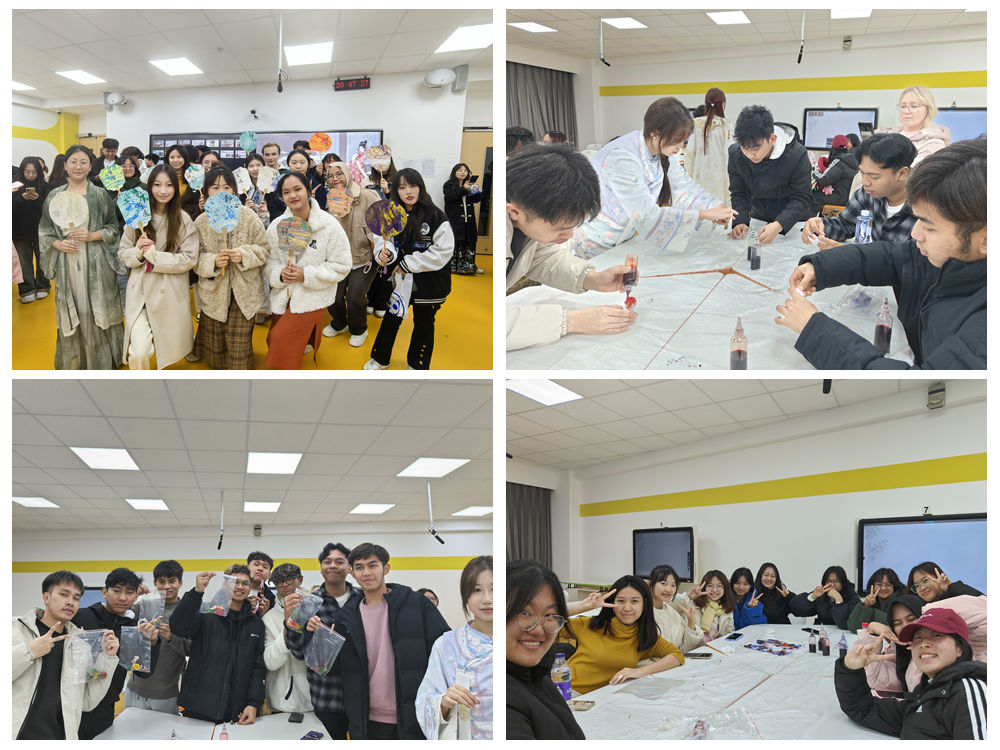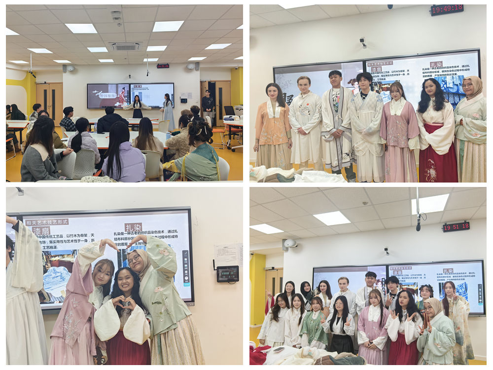 活动首先通过视频展示了中国服饰的演变历程和多民族服饰的特色。赵吉祥、黄文萍展示了马面裙、旗袍等传统服饰和藏族、苗族等少数民族的特色服饰,并进行了详细介绍。李佳怡介绍了中国传统技艺——漆扇和扎染的特点,传授了制作方法。互动交流中,在场同学兴致勃勃地体验了中国传统服饰穿戴,中外学生还在工作人员的帮助下一起制作了扎染和漆扇作品。本次活动加深了留学生对中华服饰文化的认识和理解,体验了丰富的中国服饰文化魅力,同时也为促进中外学生交流搭建了平台,帮助留学生更好地融入中国,更有效地传播中国文化。