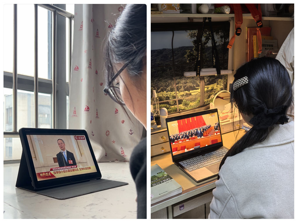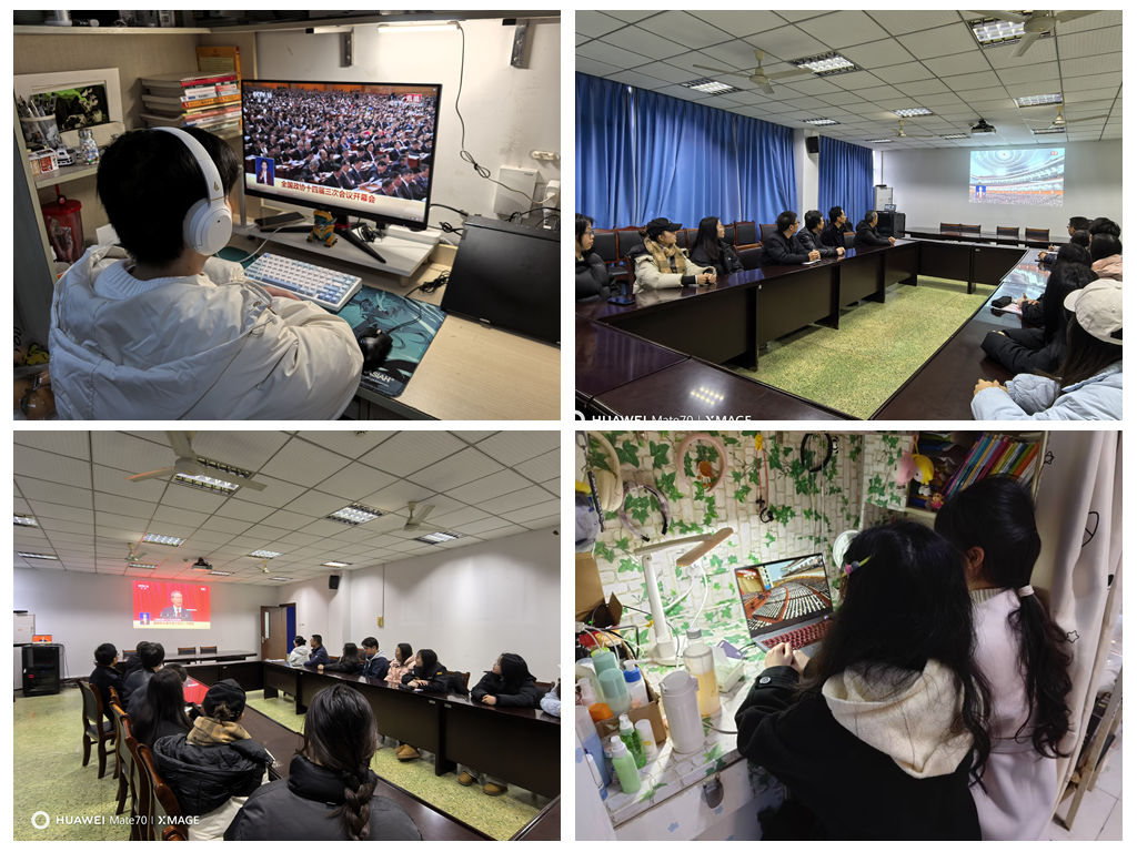 十四届全国人大三次会议和全国政协十四届三次会议分别于3月5日和3月4日在北京开幕。我院组织部分党员师生在知津楼C403集中观看学习,其他师生通过多种渠道积极关注全国两会动态,聆听政府工作报告,掀起学习热潮。