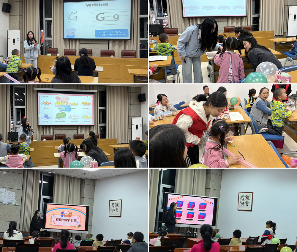 活动根据儿童年龄层次,精心设置了两个教学班级。针对6岁以上的儿童,主讲人首先通过“学科盲盒大猜想”互动游戏进行热身,随后借助生动形象的卡通教具,引导孩子们学习多学科英语单词。接着,通过“字母找找找”和“单词连连看”等趣味游戏,帮助孩子们巩固所学知识,让他们在充满乐趣的体验中轻松掌握英语。对于6岁以下的幼儿,活动以欢快的《字母歌》合唱拉开序幕。主讲人结合新鲜水果实物,生动讲解字母及单词发音,并通过“水果大闯关”和“水果蹲”等互动游戏,有效强化了孩子们的记忆效果。