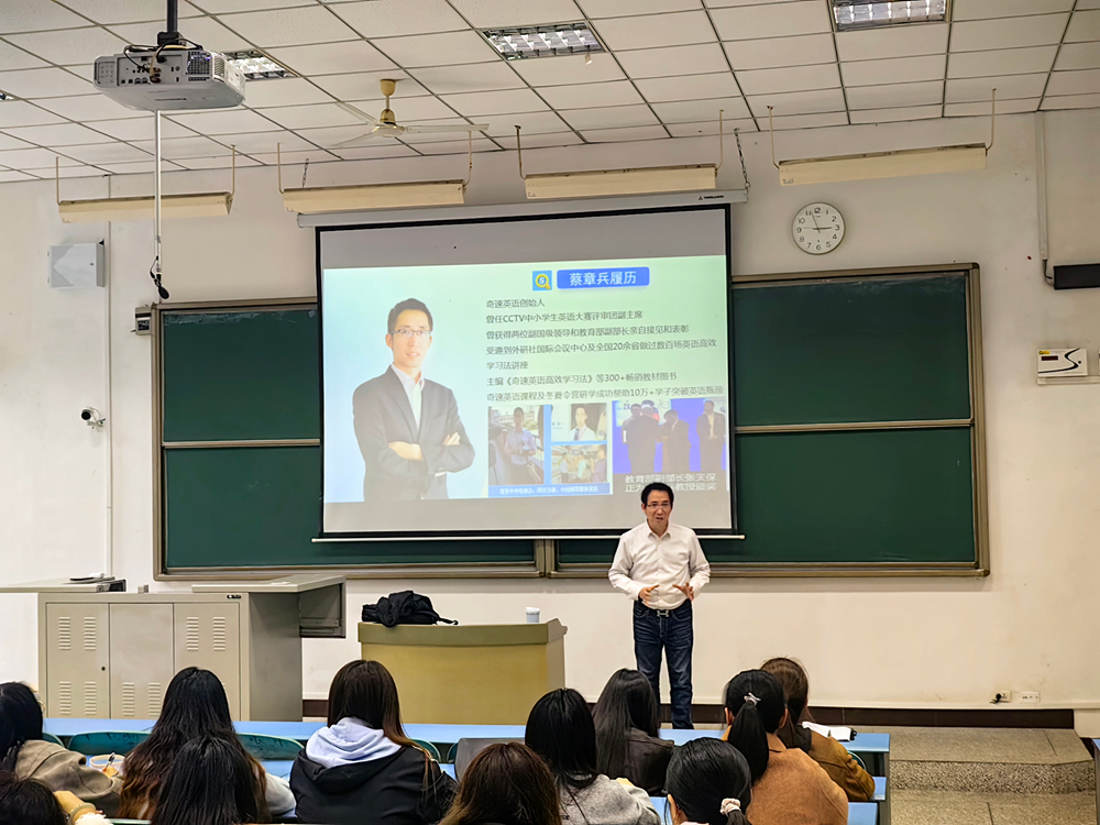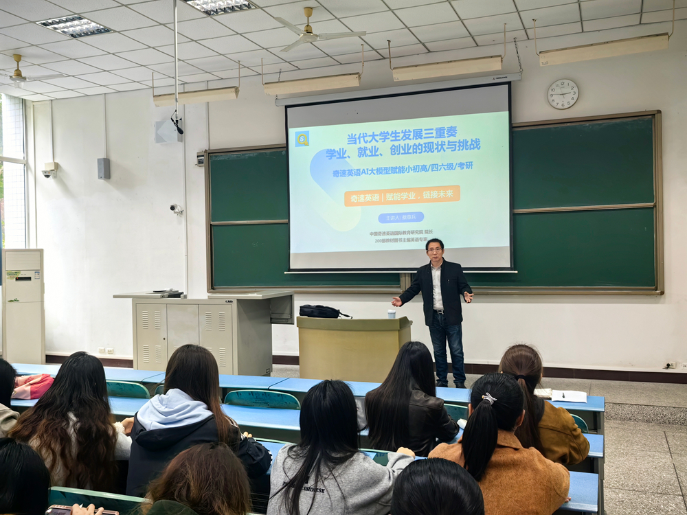 在学业发展维度,蔡章兵强调“专业精进与跨界融合”,他以奇速英语自主研发的AI智环系统为例,展示了如何将英语语言学习与人工智能技术深度融合,指出“当代大学生既要夯实语言基本功,更要掌握大数据分析、智能算法等跨学科工具”。针对就业环节,蔡章兵结合当前就业市场的发展趋势,提出“职业选择三原则”,即匹配兴趣、能力契合、顺应趋势,他特别提醒学生关注“教育数字化”带来的职业机遇,建议通过“专业认证+项目实践+行业实习”来构建核心竞争力。在创业实践模块,蔡章兵以自身团队研发英语教学产品的实例,剖析了“从小切口切入市场”“持续迭代用户需求”等创业经验,鼓励学生“在不确定性中探寻确定性”。