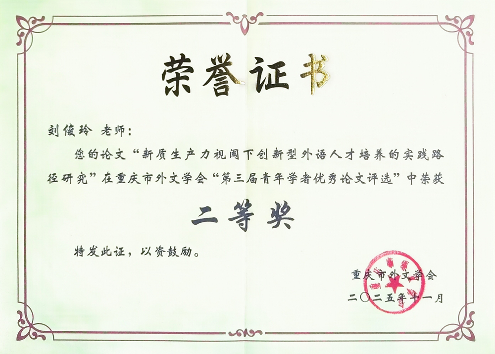 “重庆市外文学会第三届青年学者优秀论文评选”活动中,我院教师表现优异。刘俊玲撰写的论文《新质生产力视阈下创新型外语人才培养的实践研究》荣获二等奖,张晓、邵谧撰写的论文《中国神话在<月夜仙踪>中的“译述”研究》荣获三等奖,充分展现了我院青年教师的扎实科研能力与学术水平,为学院赢得了荣誉。