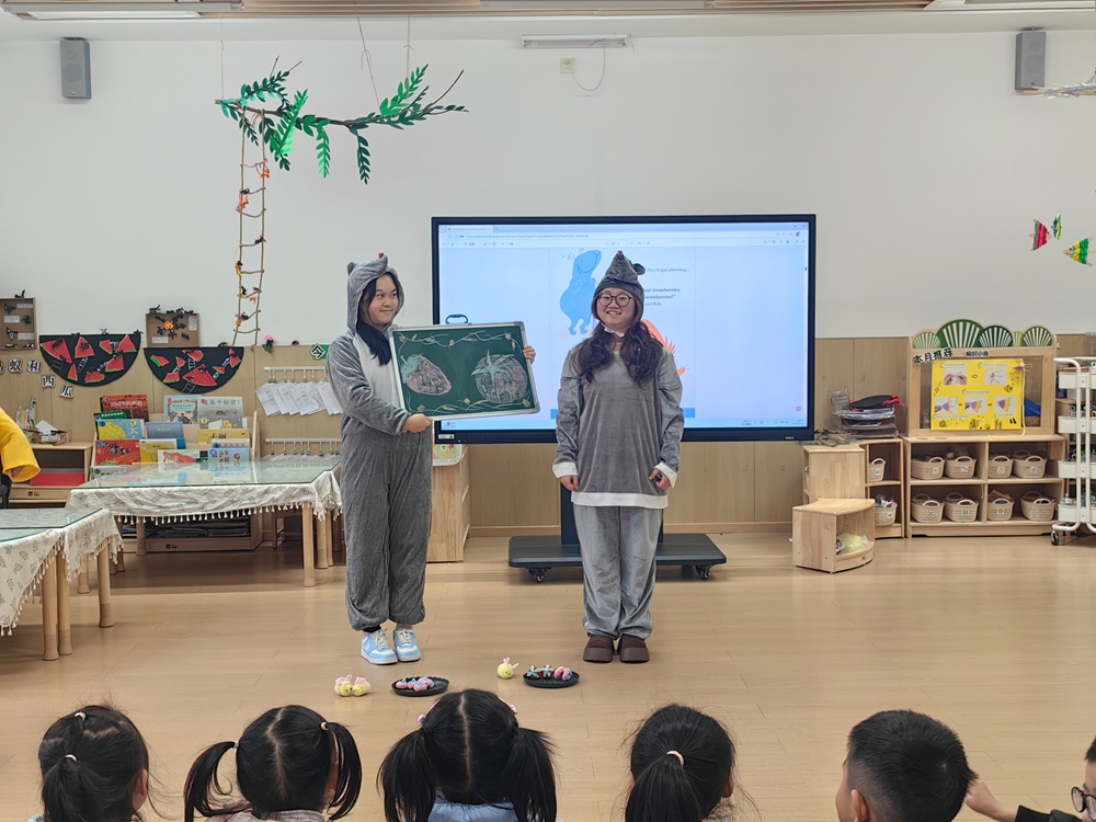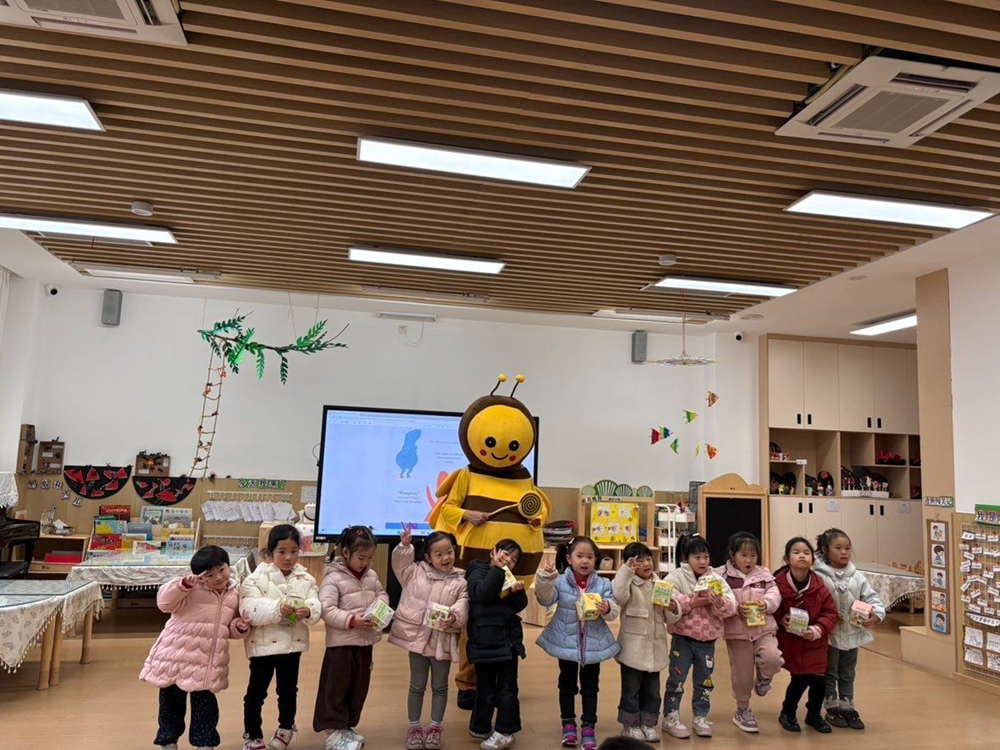 随后,志愿者们扮演绘本角色豚鼠Bob、Ginger和小蜜蜂,生动演绎了故事情节。“小蜜蜂”角色手持玩偶走下舞台,与孩子们进行亲切互动,现场气氛热烈、欢快融洽。活动尾声,志愿者们向每位小朋友赠送小盆栽,寓意“在英语学习的土壤中播下兴趣的种子,静待成长与绽放”,孩子们在温暖氛围和丰硕收获中圆满结束了此次英语欢乐之旅。